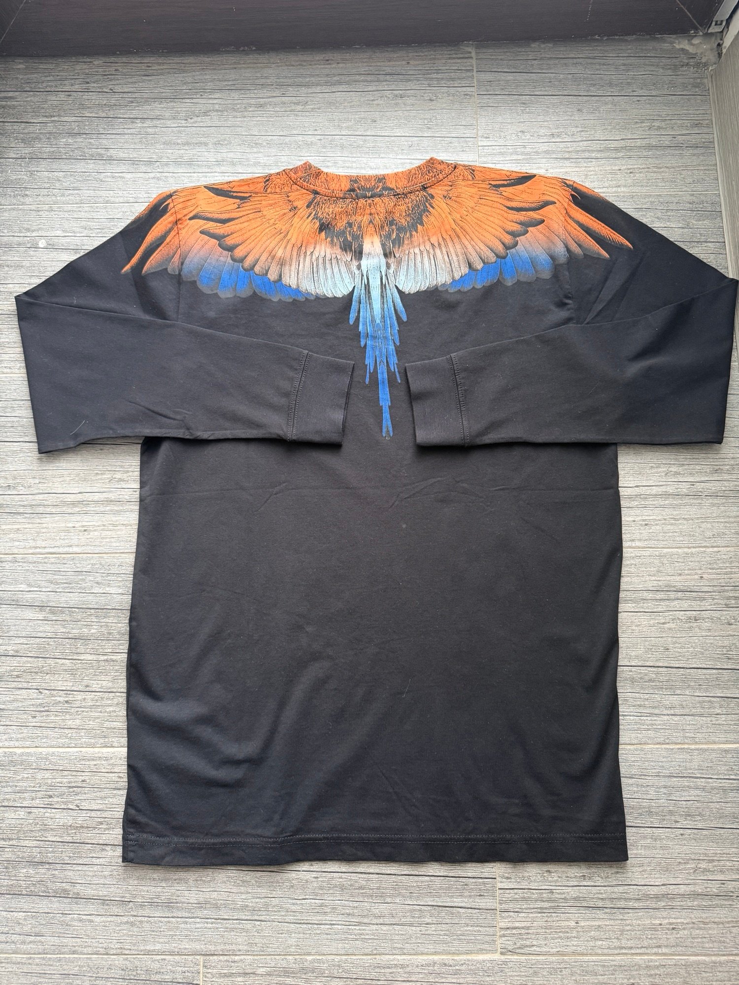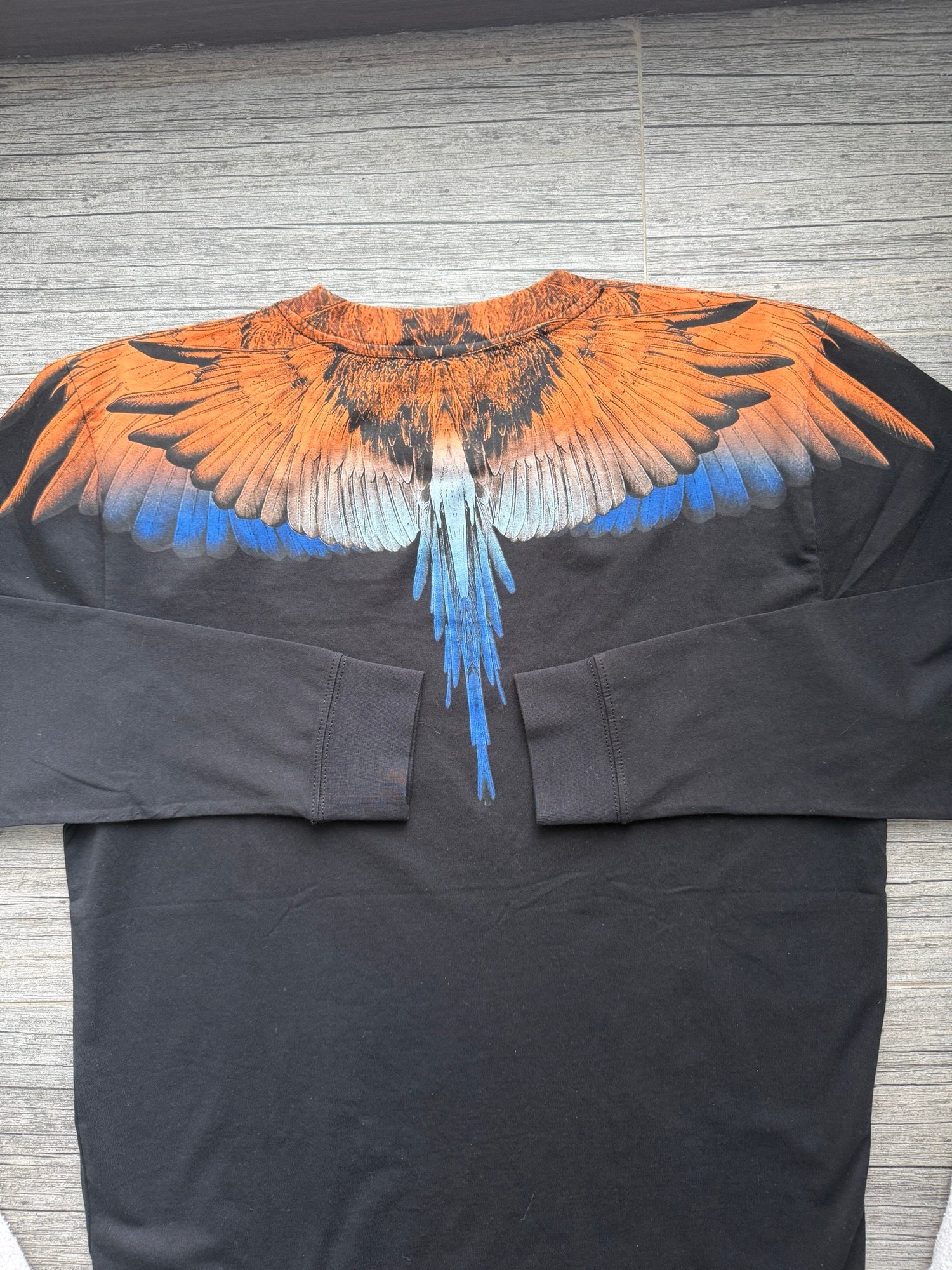Bluza este de culoare *neagră, iar designul este pus în valoare de emblematicul imprimeu cu **aripi, poziționat în zona umerilor, în combinații vibrante de **portocaliu intens și albastru*, oferind un contrast puternic și un impact vizual deosebit. Croiala este modernă, lejeră, cu finisaje de calitate superioară, specifice unui brand high-end.